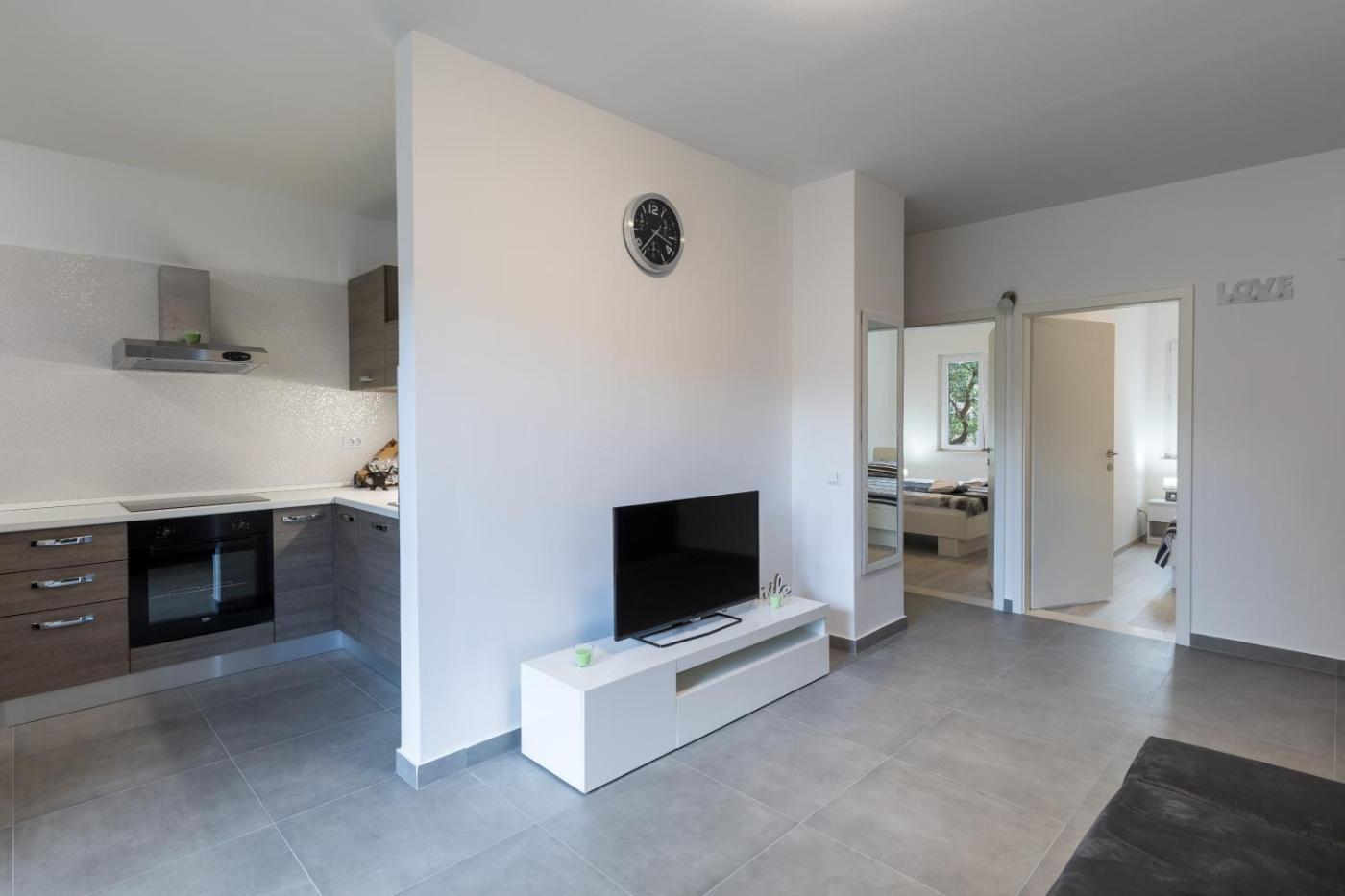 Two-Bedroom Apartment. Boasting a private entrance, this air-conditioned apartment includes a kitchen, 2 bedrooms and 1 bathroom with a walk-in shower and a hairdryer. In the fully equipped kitchen, guests will find a stovetop, a refrigerator, a microwave and a tea and coffee maker. Featuring a terrace with garden views, this apartment also offers a washing machine and a flat-screen TV. The unit has 2 beds.