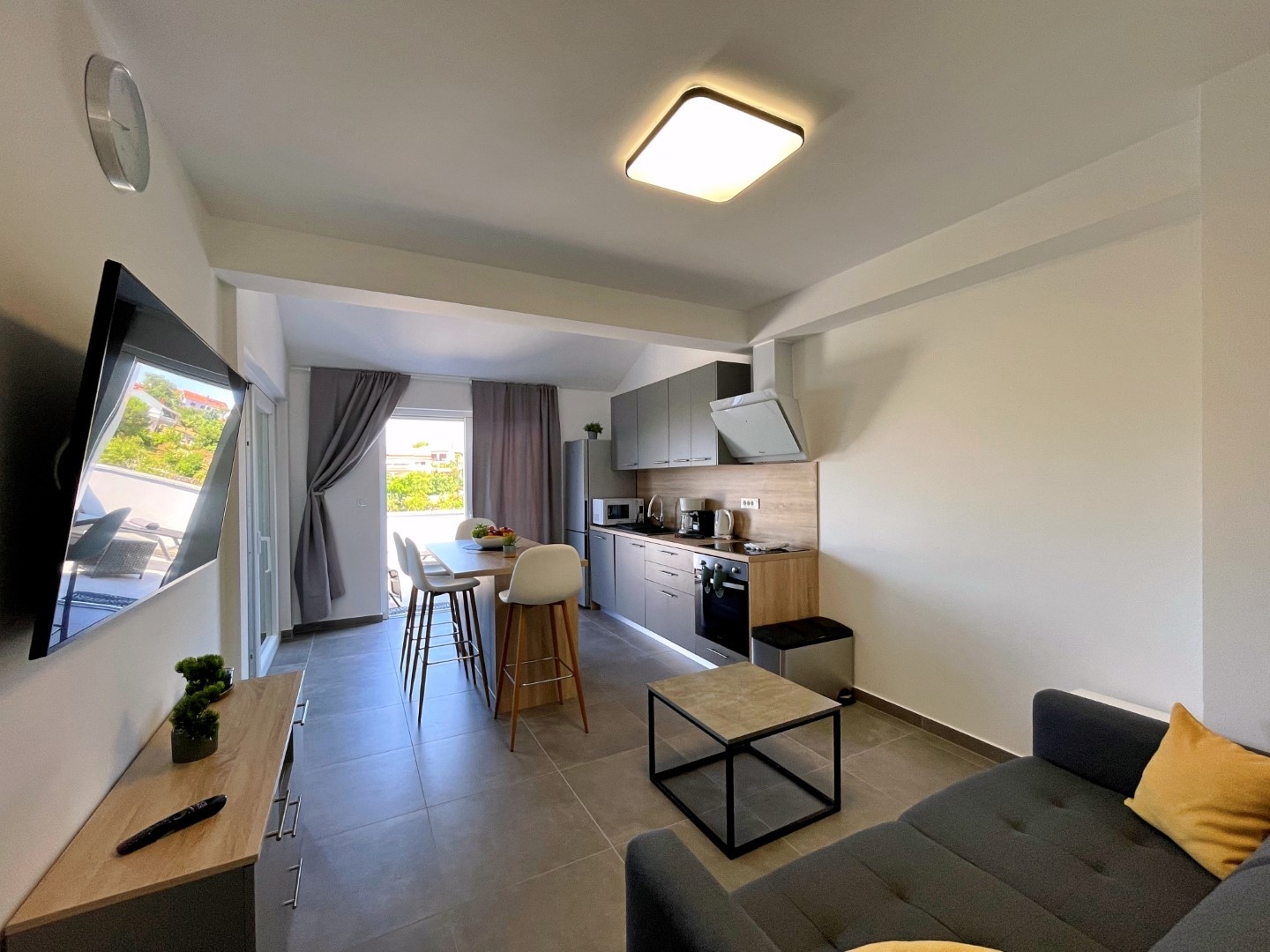 Apartment can accommodate 6 guests. Beds are situated in 2 sleeping rooms, but also in the living room, within 52m2. Guests can use a private terrace to enjoy the warm summer evenings. The apartment offers the sea view. INCLUDED IN THE PRICE: tourist tax, final cleaning, air-conditioning, central heating, parking, garage, internet, iron, ironing board, hairdryer. The availability of additional services for your chosen dates of stay, as well as their prices (if none are listed) must be checked ahead of time. Any additional services not shown in the price calculation are payable directly to the property owner and only if used by the visitor.