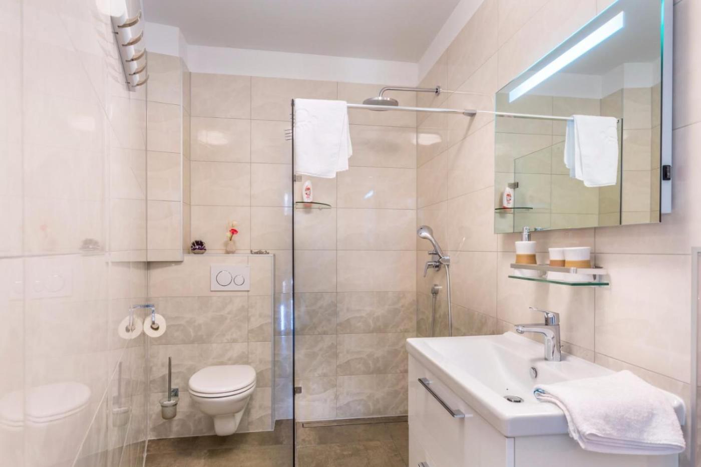 Two-Bedroom Apartment. This apartments special feature is the hot tub. Featuring a private entrance, this air-conditioned apartment consists of 1 living room, 2 separate bedrooms and 1 bathroom with a walk-in shower and a hairdryer. Guests will find a stovetop, a refrigerator, a dishwasher and kitchenware in the kitchen. The apartment also offers a barbecue. The spacious apartment provides a washing machine, soundproof walls, a tea and coffee maker, a flat-screen TV with satellite channels, as well as sea views. The unit offers 4 beds. ;