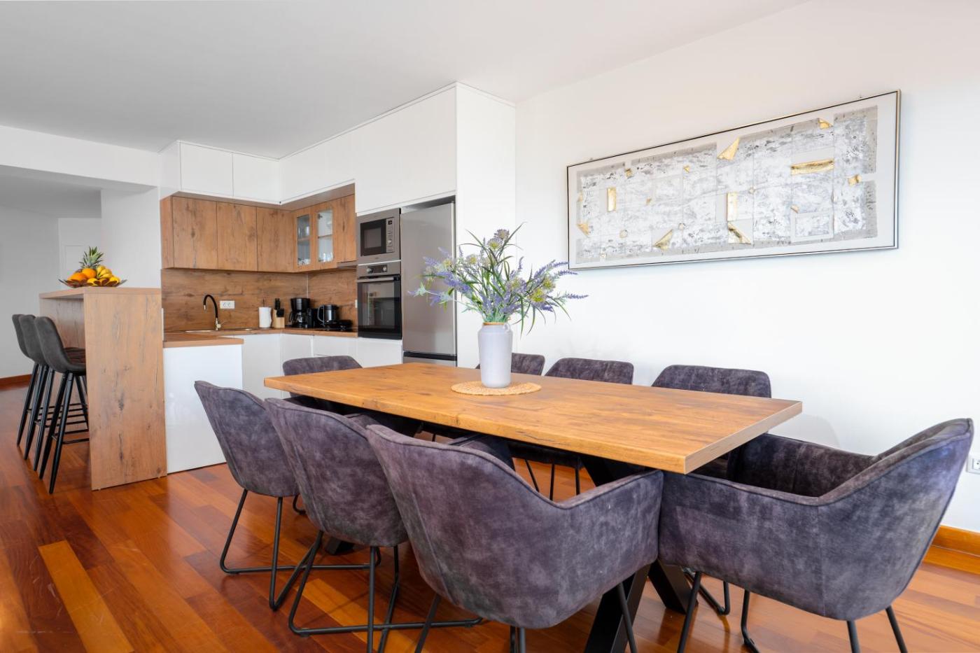 The spacious apartment with a terrace and sea views features 3 bedrooms, a living room, a flat-screen TV, an equipped kitchen with a dishwasher and an oven, and 3 bathrooms with a hot tub. Towels and bed linen are provided in the apartment. The property offers mountain views.