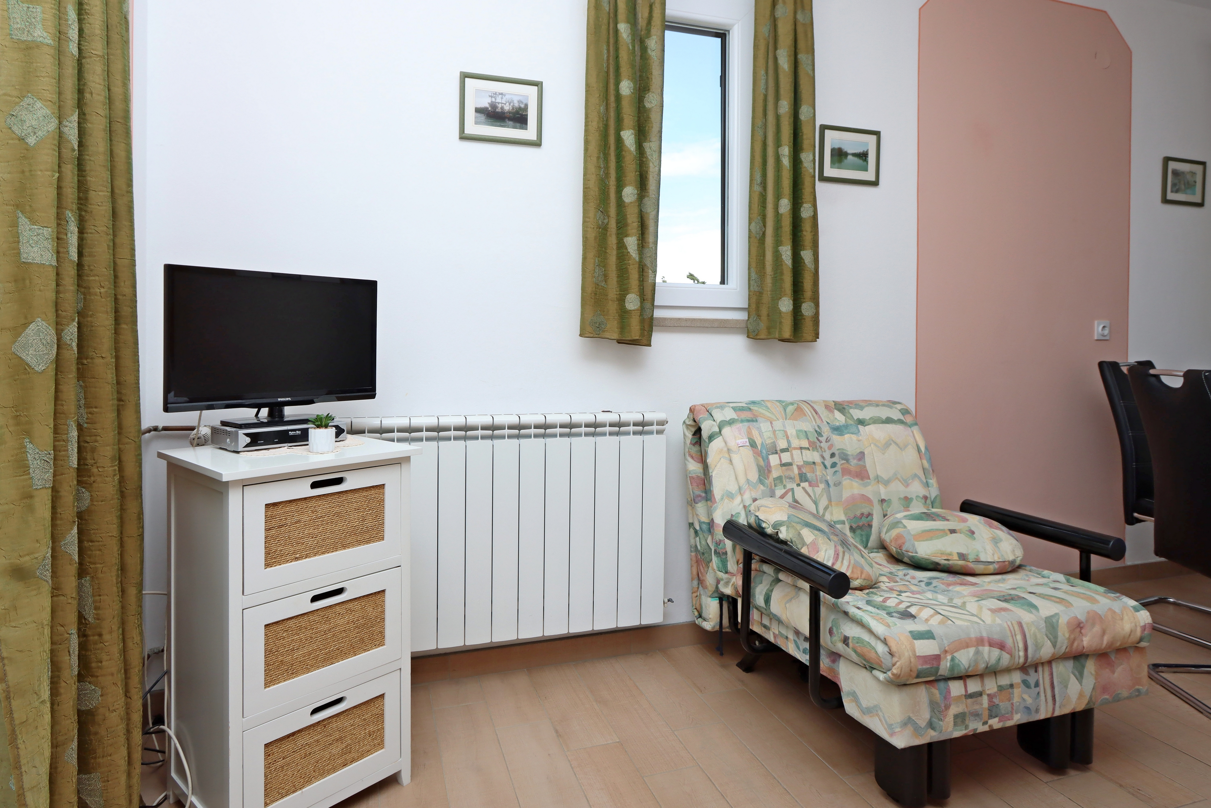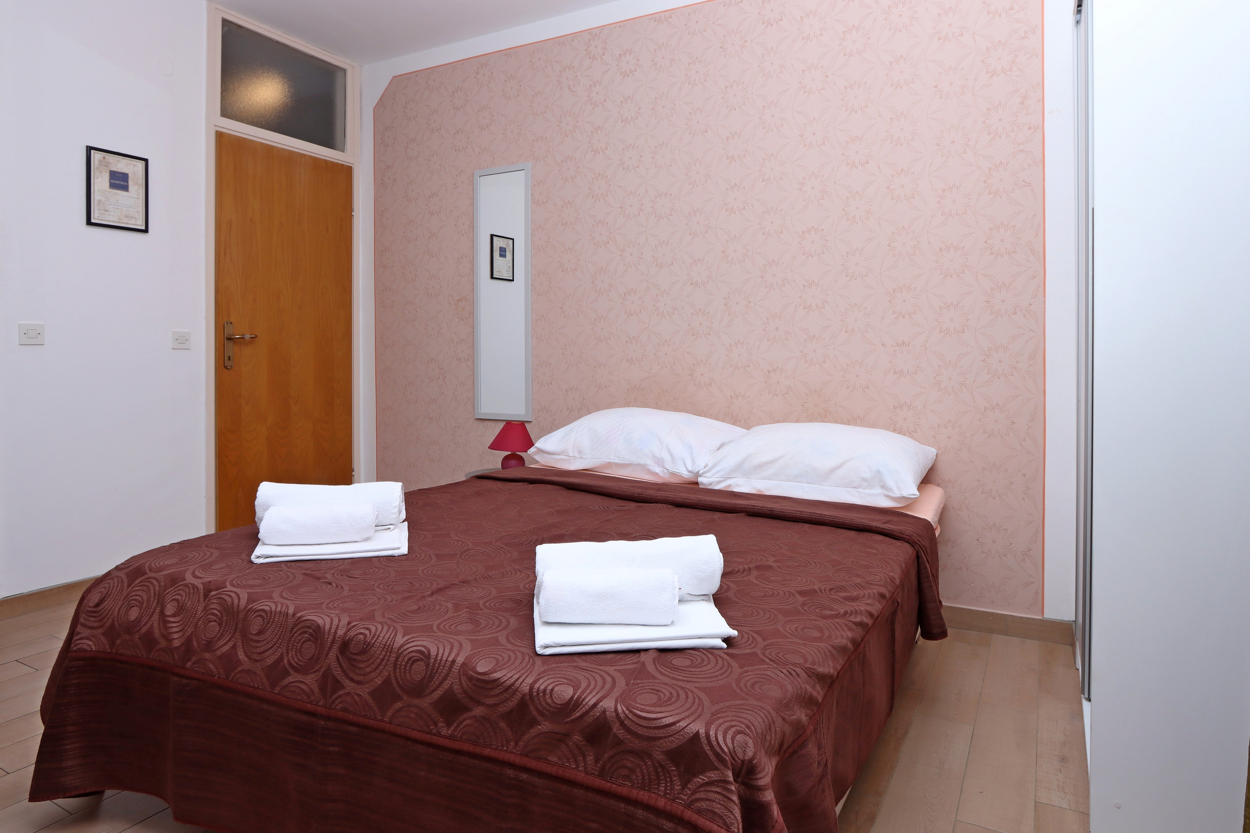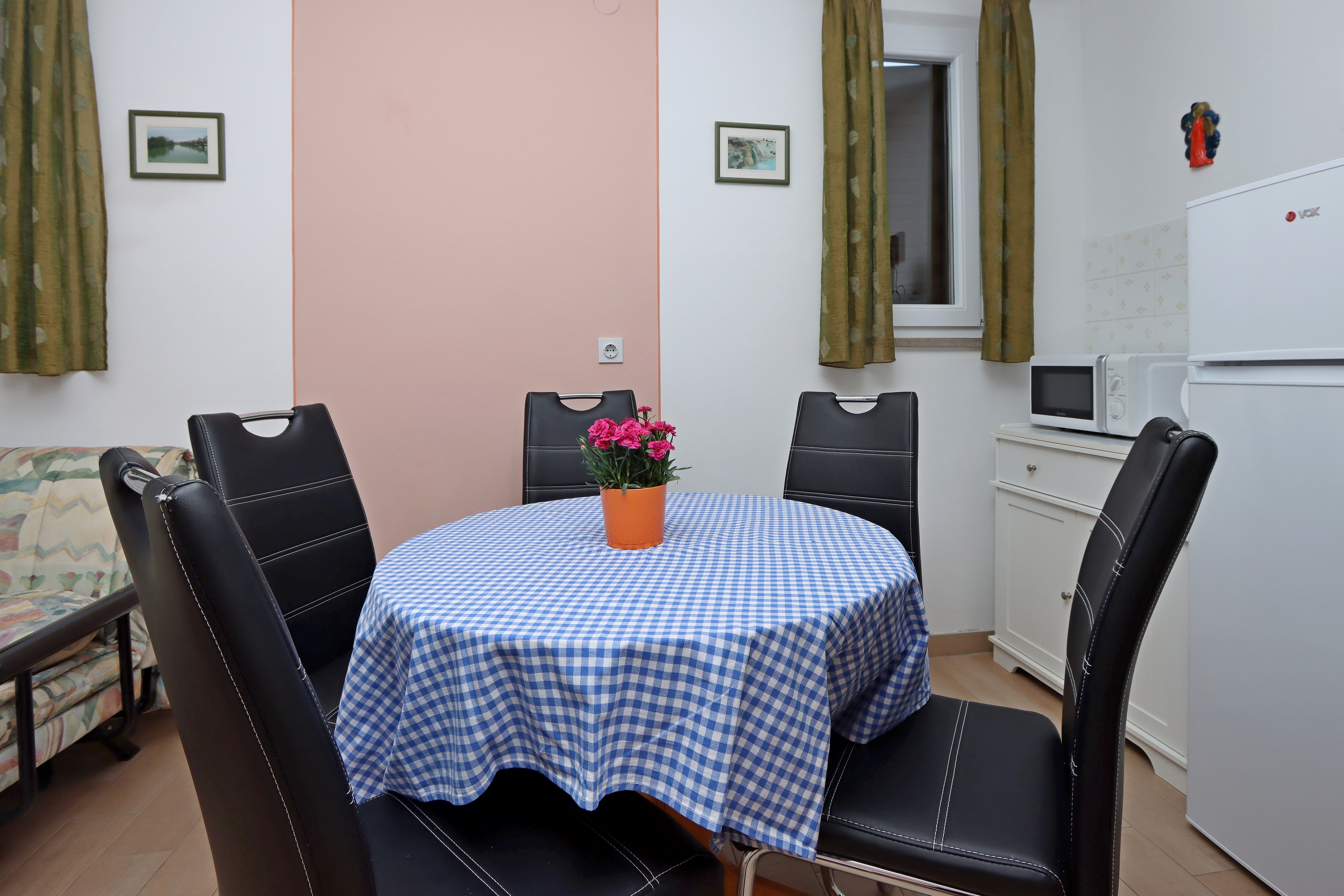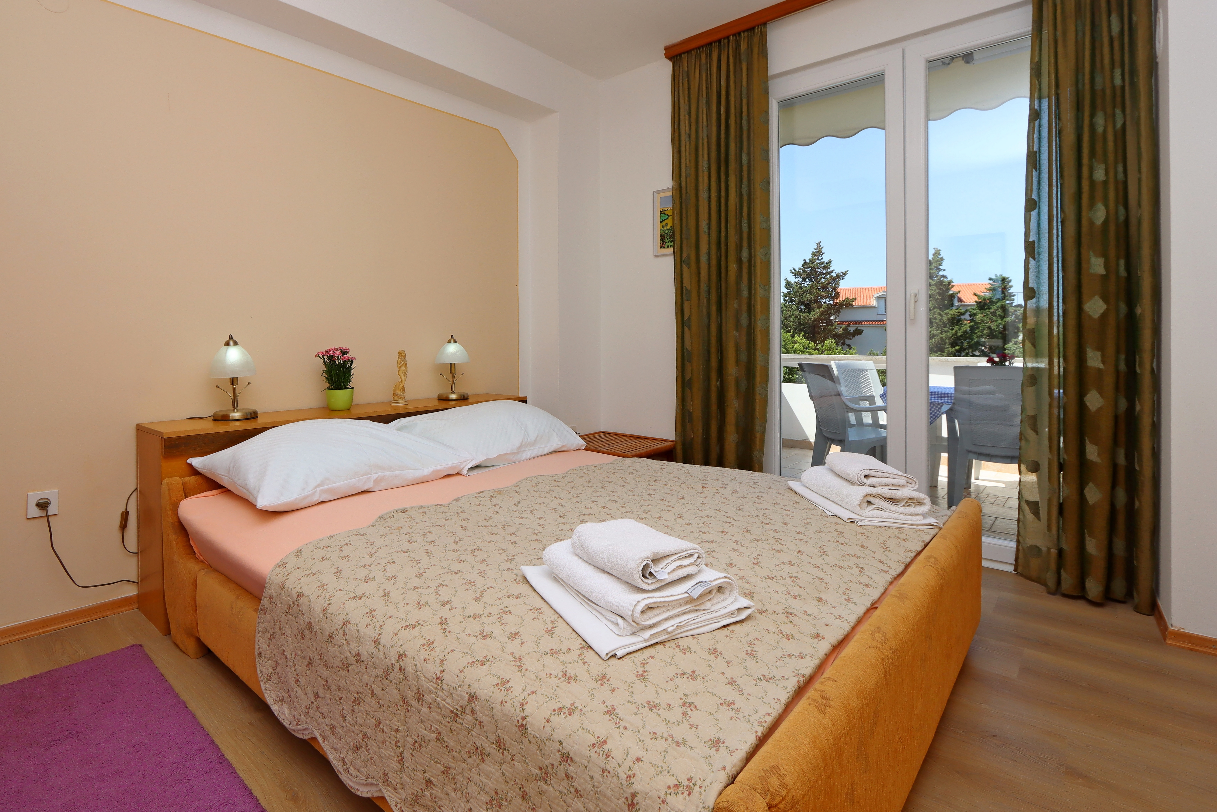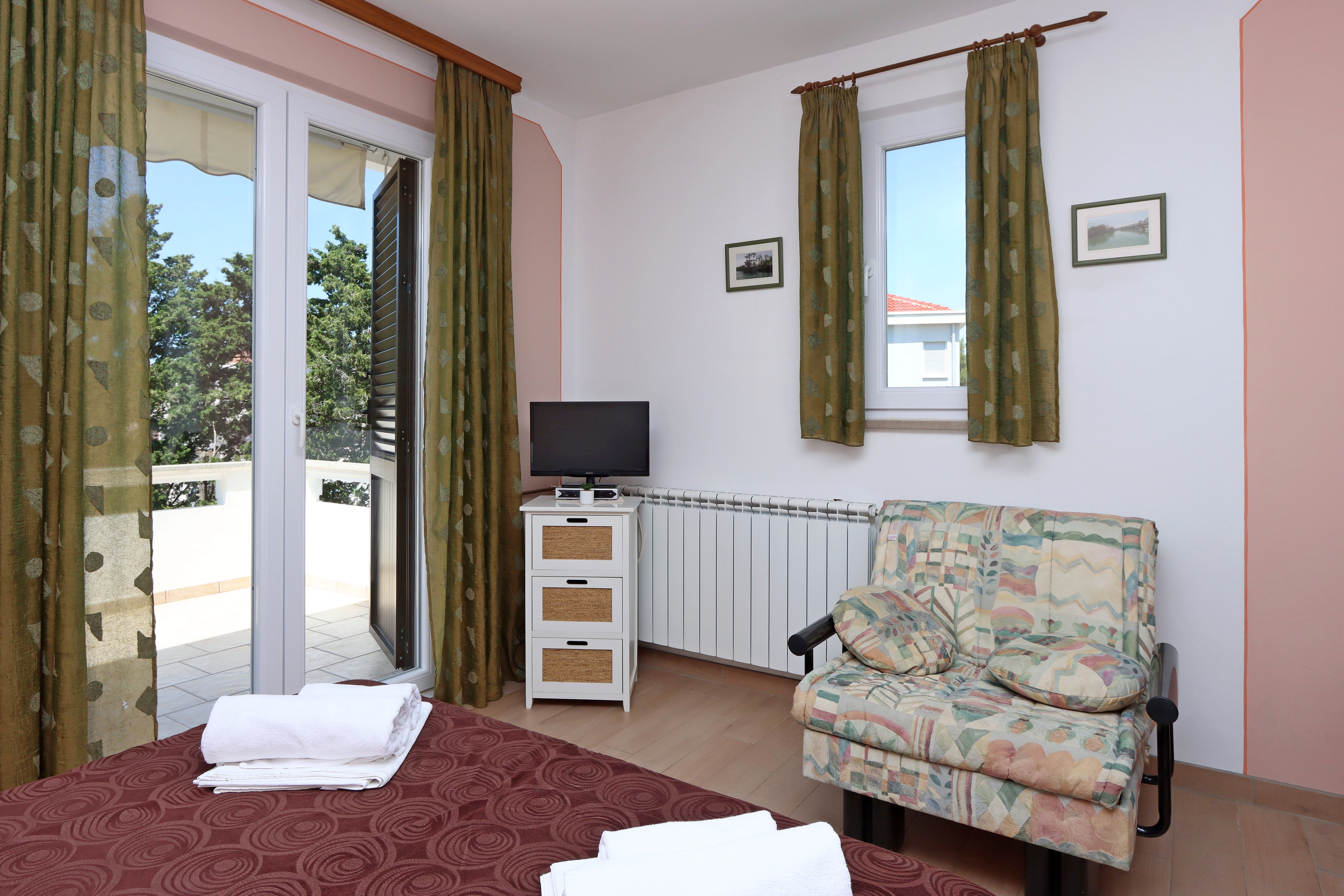 Apartment can accommodate 4 guests. Beds are situated in 1 sleeping rooms, but also in the living room, within 38m2. Guests can use a private terrace to enjoy the warm summer evenings. Food can be prepared using barbecue which is shared with other guests too. Shared pool is on disposal during stay. For the booked accommodation unit the deposit is paid directly to the owner upon check-in (deposit amount is displayed on the website) INCLUDED IN THE PRICE: tourist tax, final cleaning, air-conditioning, central heating, pool, parking, internet, baby cot, iron, ironing board. OBLIGATORY ADDITIONAL COSTS: deposit (€200.00 one-time payment), short stay fee (surcharge depending on a number of booked nights: 30% - 1, 20% - 2, 10% - 3). OPTIONAL ADDITIONAL COSTS: laundry (€10.00 washing). The availability of additional services for your chosen dates of stay, as well as their prices (if none are listed) must be checked ahead of time. Any additional services not shown in the price calculation are payable directly to the property owner and only if used by the visitor.
