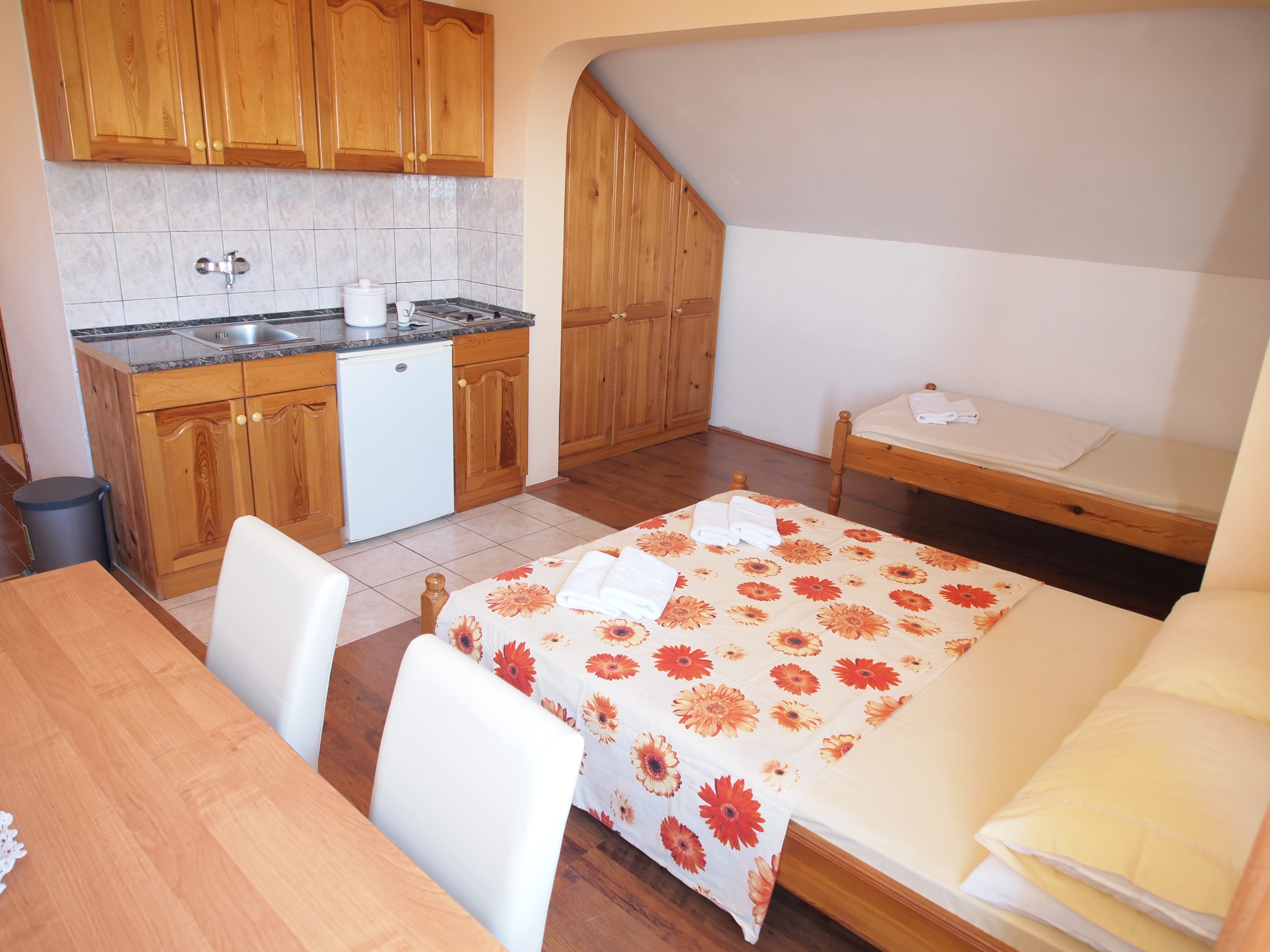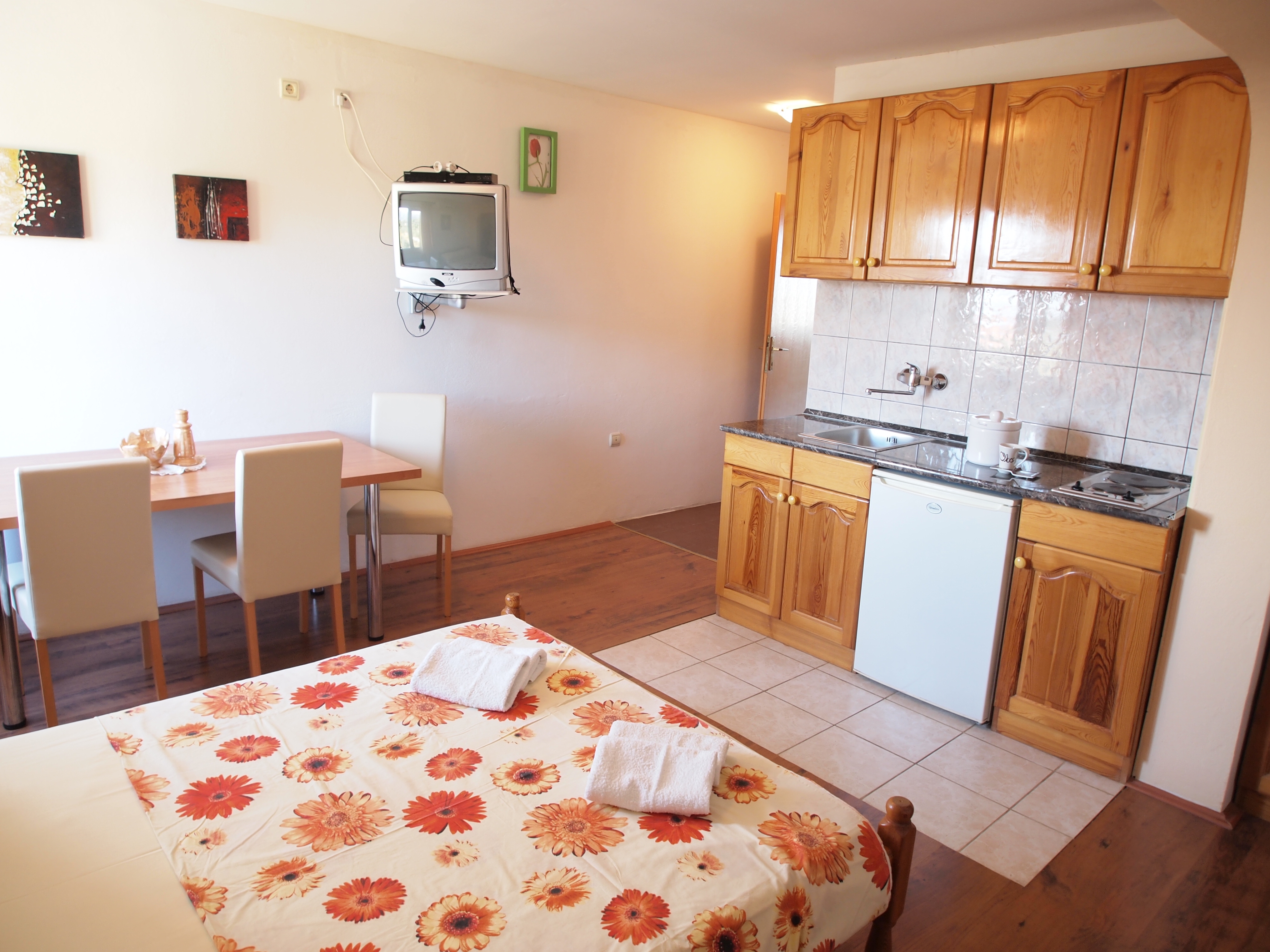Apartment can accommodate 5 guests. Beds are situated in 1 sleeping rooms, but also in the living room, within 46m2. Food can be prepared using barbecue which is shared with other guests too. There is no balcony or terrace in the reserved accommodation unit. INCLUDED IN THE PRICE: tourist tax, final cleaning, air-conditioning, parking, internet. The availability of additional services for your chosen dates of stay, as well as their prices (if none are listed) must be checked ahead of time. Any additional services not shown in the price calculation are payable directly to the property owner and only if used by the visitor. Discounts to the base price: free day 14=13 (for reservations of 14 or more days you get one free day for the stay until 31122026).