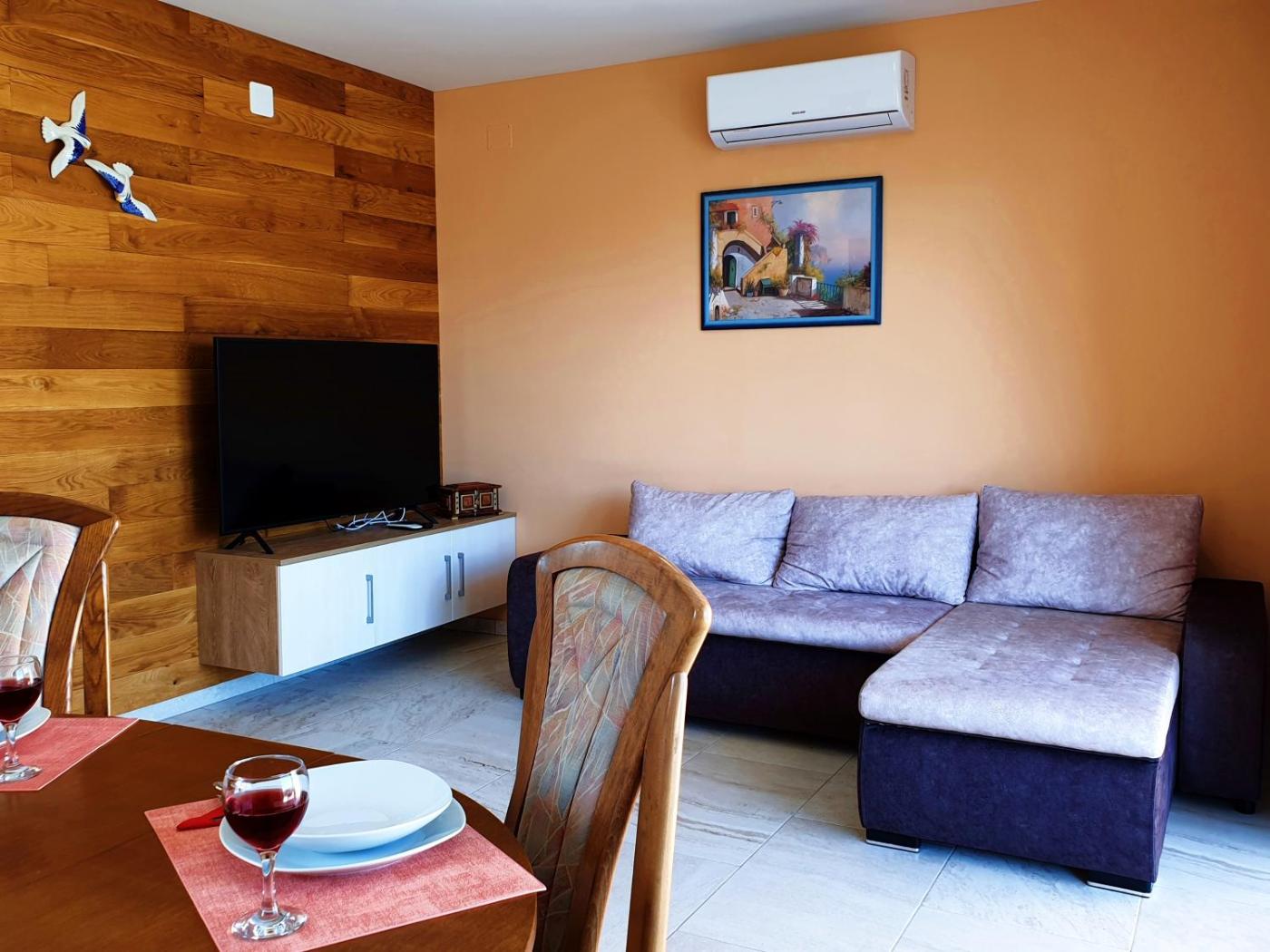 Two-Bedroom Apartment with Terrace and Sea View. Featuring 2 bedrooms, this spacious apartment offers 1 bathroom with a shower, a seating area and terraceyou can relax. Meals can be prepared in the well-fitted kitchen, which comes with a stovetop, a refrigerator and kitchenware. The apartment provides air conditioning, a private entrance, a dining area, a TV with satellite channels, as well as sea views. The unit has 2 beds. ;