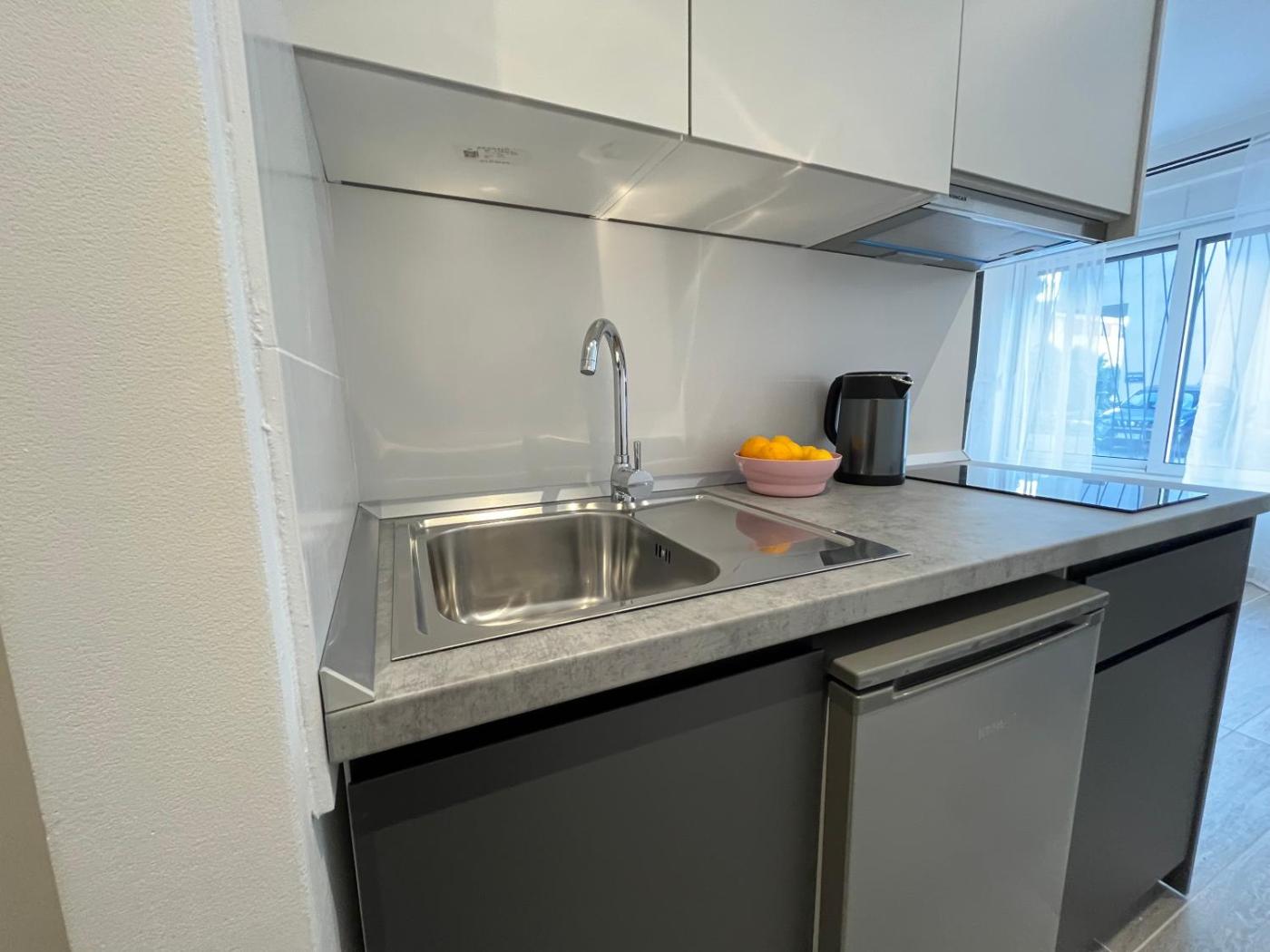 Studio Apartment with One Double Bed. Boasting a private entrance, this air-conditioned apartment features a kitchen, 1 bedroom and 1 bathroom with a walk-in shower and a hairdryer. Meals can be prepared in the well-fitted kitchen, which features a stovetop, a refrigerator and kitchenware. This apartment has soundproof walls, a tea and coffee maker, flat-screen TV with cable channels, as well as chocolate for guests. The unit has 1 bed.