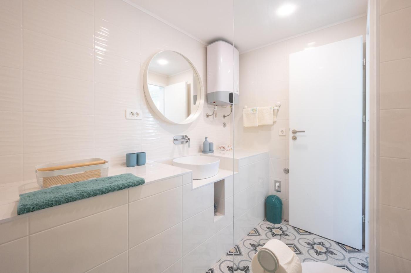 One-Bedroom Apartment. Featuring a private entrance, this air-conditioned apartment is comprised of a kitchen, 1 bedroom and 1 bathroom with a walk-in shower and a hairdryer. The apartments kitchen, which has a microwave and an electric kettle, is available for cooking and storing food. The apartment features tiled floors, a seating area with a flat-screen TV, a dining area, a wardrobe as well as sea views. The unit offers 1 bed.