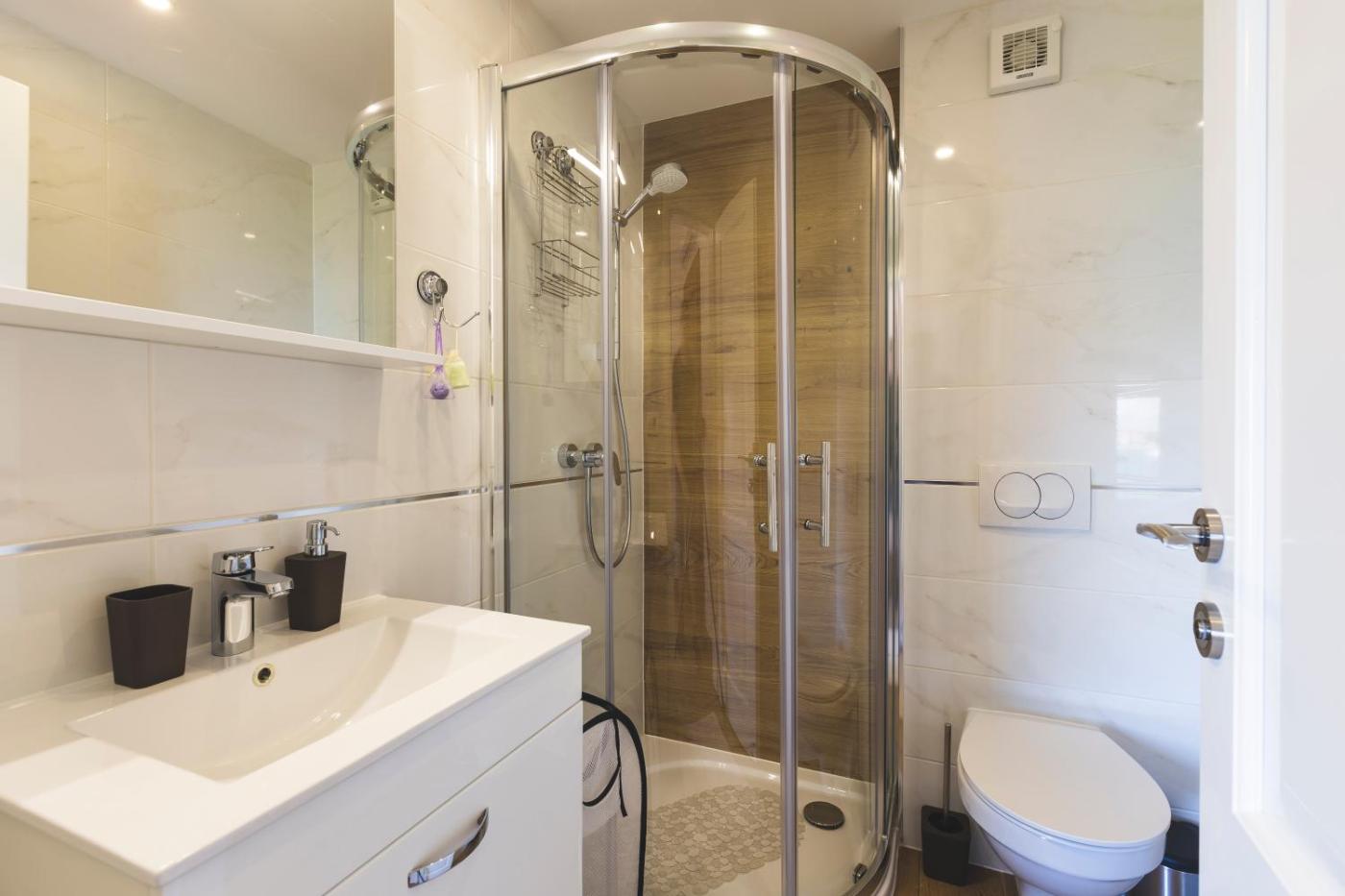 Two-Bedroom Apartment. Boasting a private entrance, this air-conditioned apartment features 1 living room, 2 separate bedrooms and 1 bathroom with a walk-in shower and a hairdryer. Guests can make meals in the kitchen that has a stovetop, a refrigerator, kitchenware and an oven. Featuring a terrace with sea views, this apartment also features soundproof walls and a flat-screen TV with satellite channels. The unit has 3 beds.